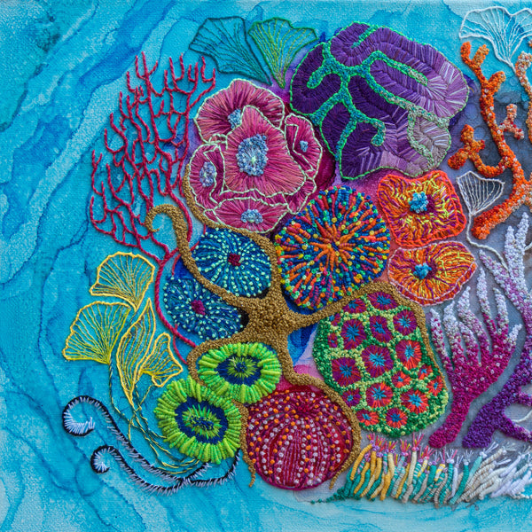 "I’m hugely inspired by nature under the microscope and the desire to bring awareness to our natural environment, I use many recycled, upcycled and repurposed materials to create wondrous worlds of colourful escapism"