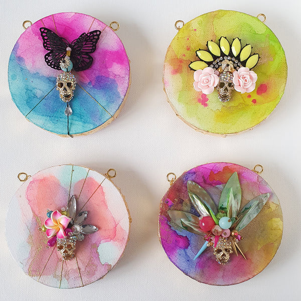 A collection inspired by the Mexican Festival, Day of the Dead. A fun and colourful collection, painted with alcohol ink on canvas and meticulously embroidered and beaded.