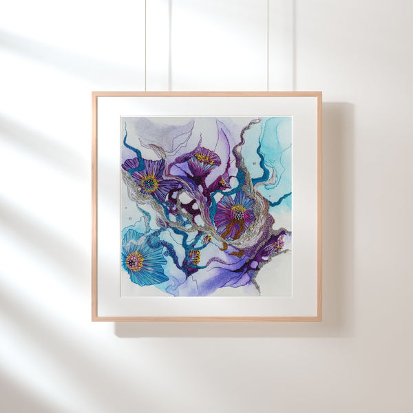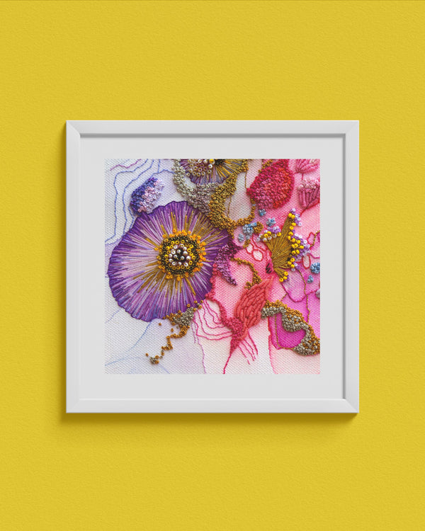 Welcome to the Mojo & Muse Limited Edition Print Collection — a curated series of fine art prints that showcase the rich detail, vibrant colour, and intricate textures of my original works. Each piece in the original Viola artworks series is the result of 80 to 100 hours of meticulous hand embroidery. The series explores escapism through abstracted nature, colour, and texture.