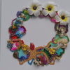 The Coral Wreath is an abstract series that takes inspiration from the hustle and bustle of a busy living coral reef with tons of different colours, textures and contrasts of sea life on the sea bed. I took inspiration from my backpacker days, traveling through South East Asia, snorkeling above these wonderful colourful worlds and seeing beautiful, floating Plumeria flowers on the surface of the sea.