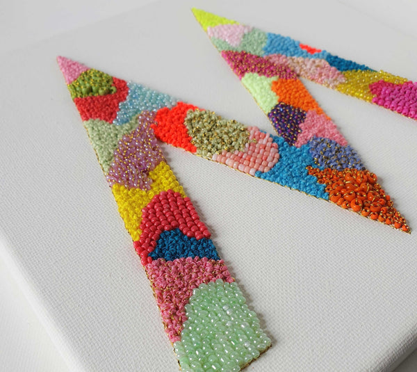 Painted with alcohol ink and hand embroidered with yarns, threads, seed beads on canvas.